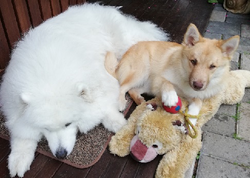 Moriin voi kesäisin törmätä Rovaniemellä. Morilla on seuralaisena samojedi.